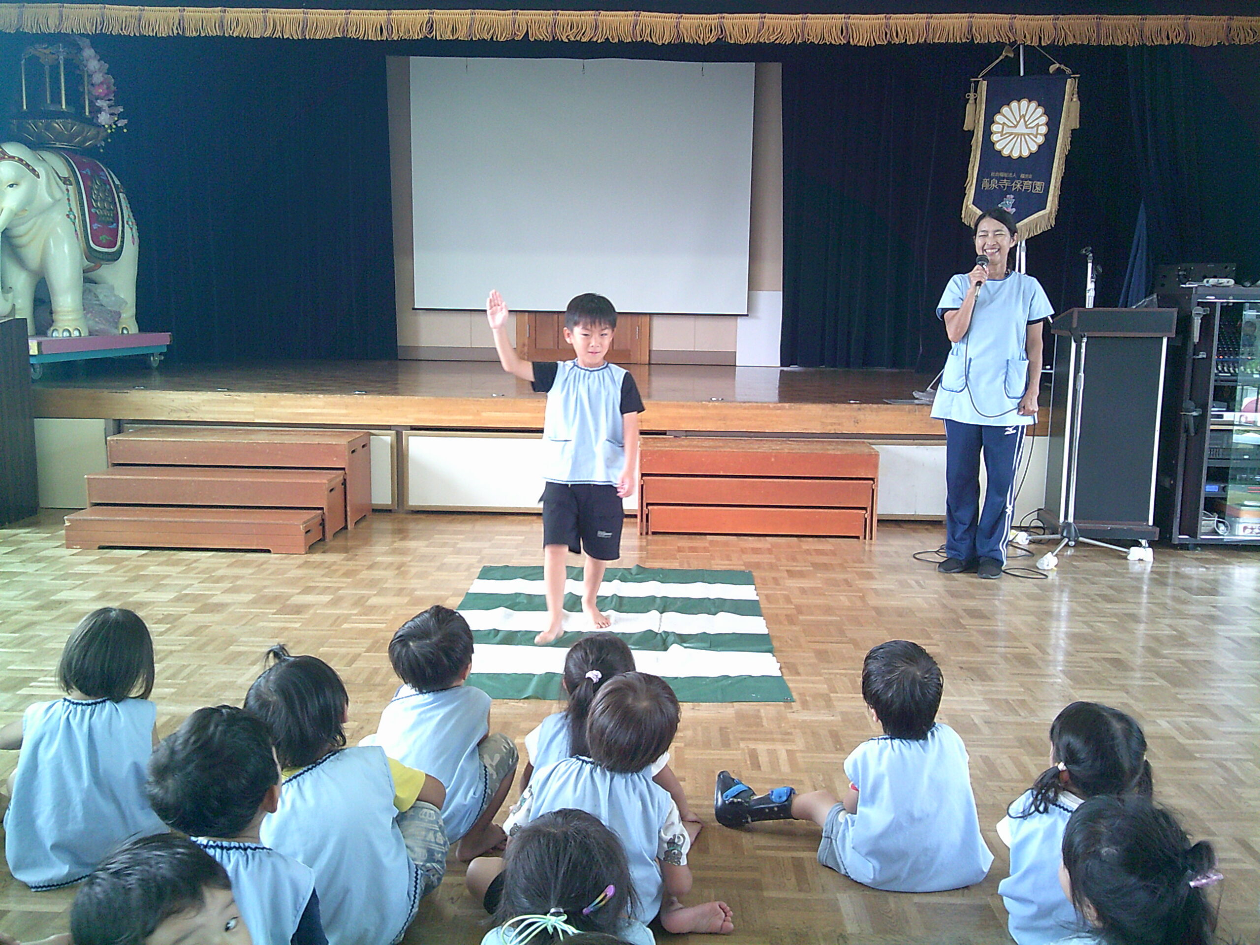 外で横断歩道の渡り方を学んだ後は、ホールに移動し再確認しました。上手に出来ました!!最後にDVDを見て、保育者と横断歩道の渡り方を学びました。