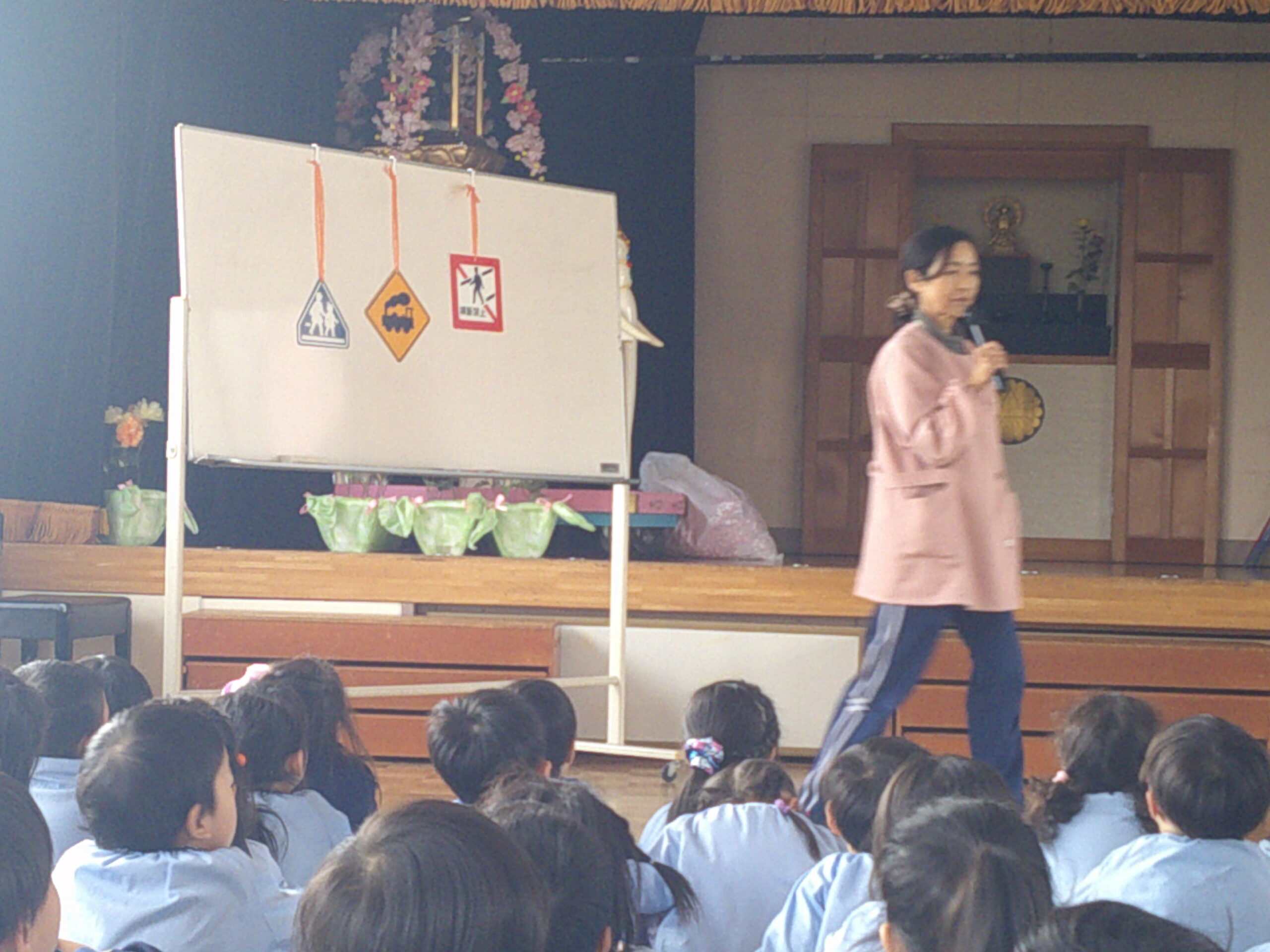 1年間学んだことをみんなで再確認しました。かもさんは交通ルールを守り、小学校に元気に行けるといいですね。