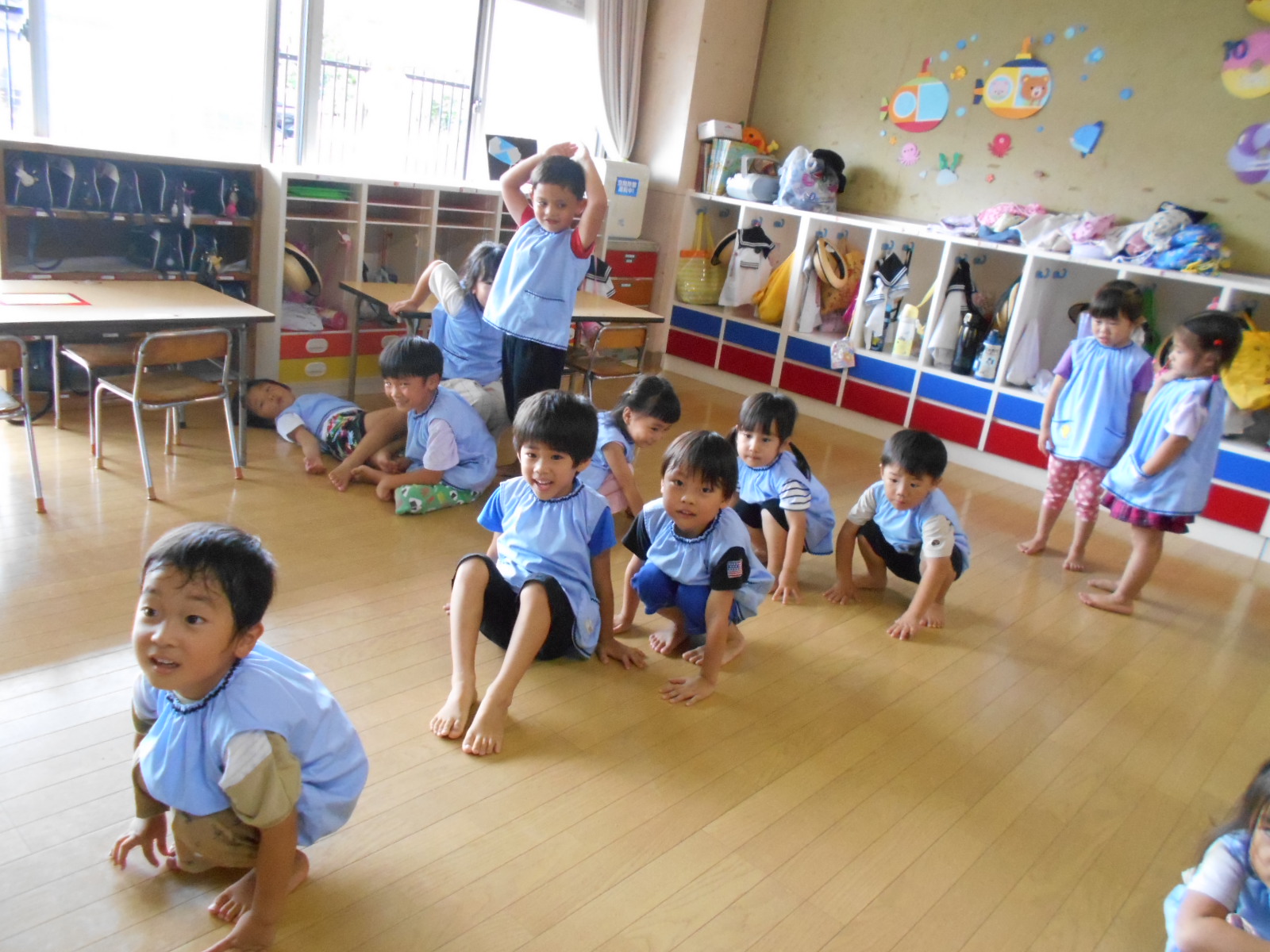 午後では石ゲームを行いました。曲に合わせてリズムにのって曲が止まった時にみんなが子ども達が色んな石の形になって楽しく行いました🎵