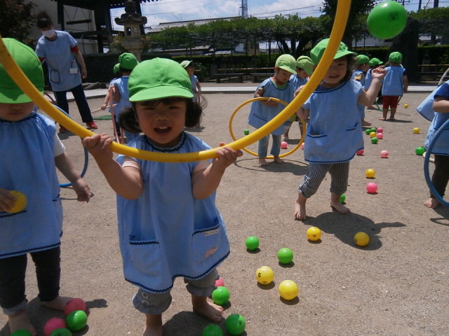 広いお庭でフラフープやボールで遊びました!フープを転がしたり、ボールを投げたりたくさん体を動かして楽しく過ごしました♪
