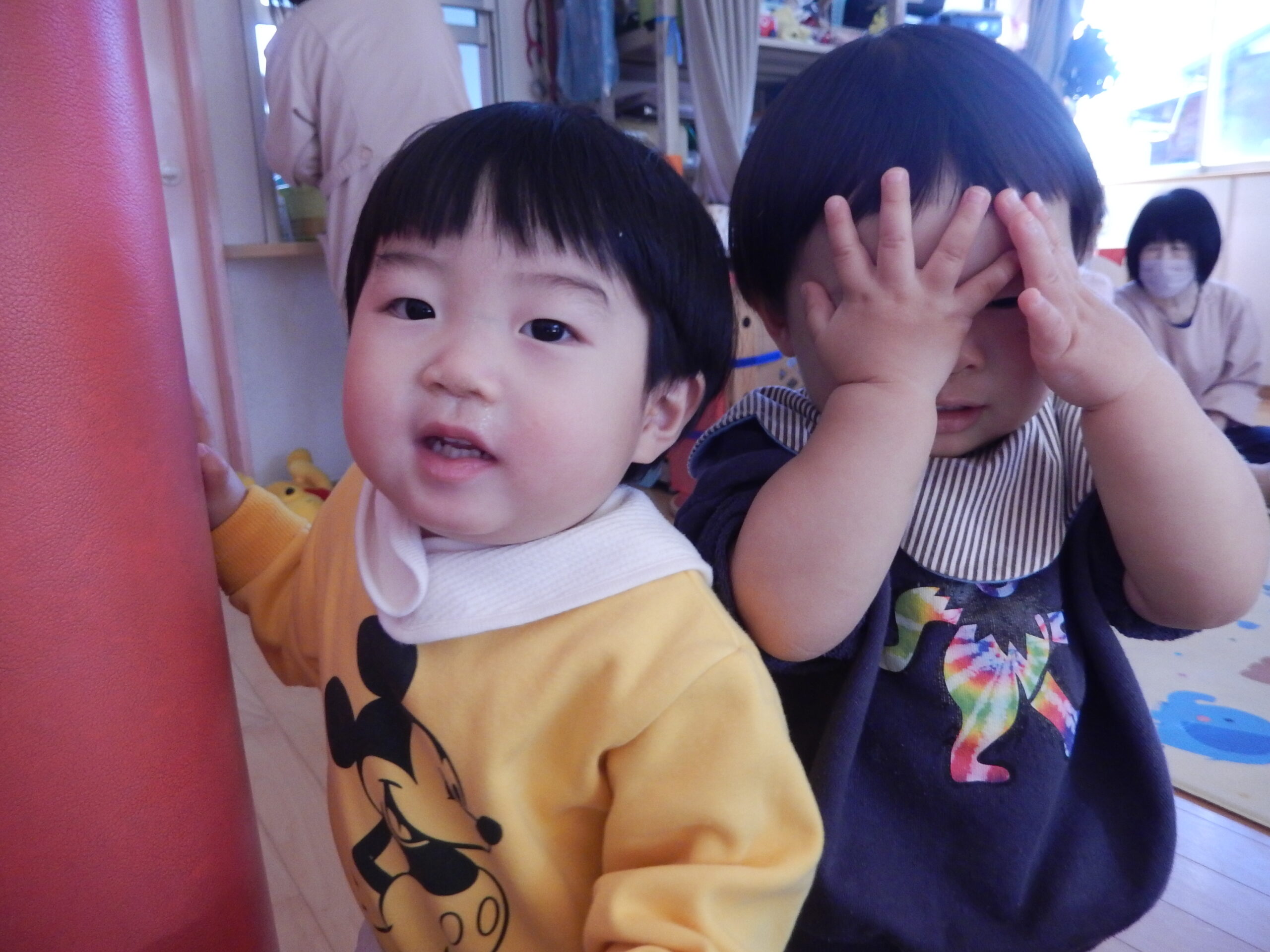 先生が「いないいないばあ」というと、真似して手を動かしたり、壁から顔をのぞかせる姿が見られます😊