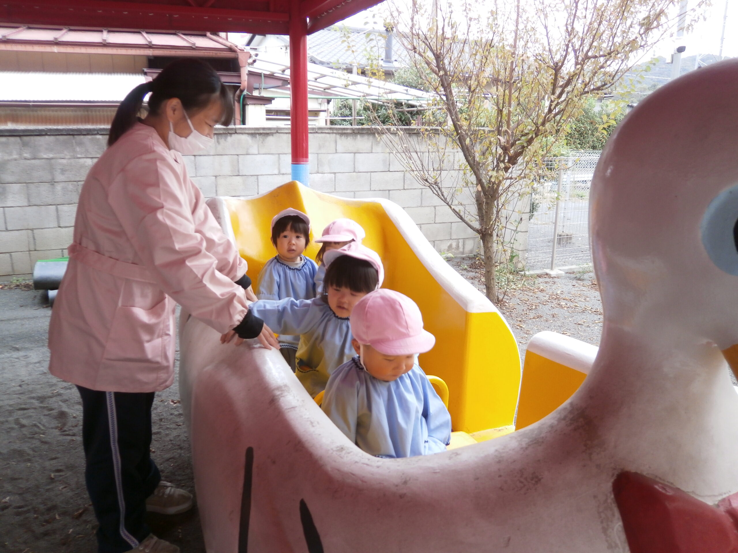 保育者に揺らしてもらい、いざ出発!どこにいくのかな~?