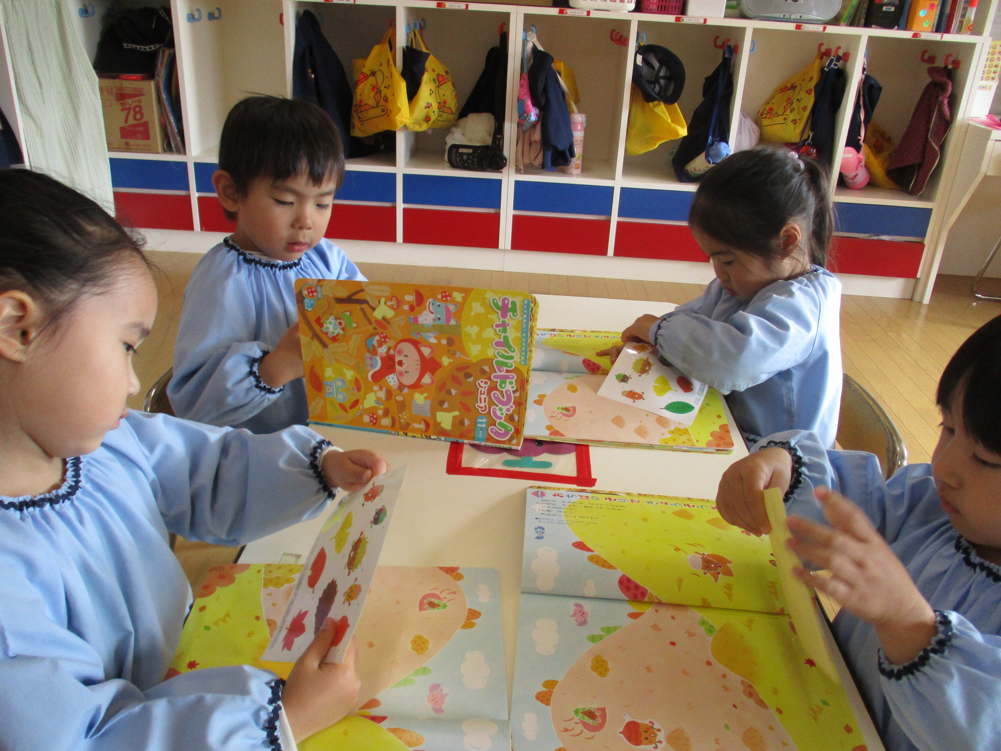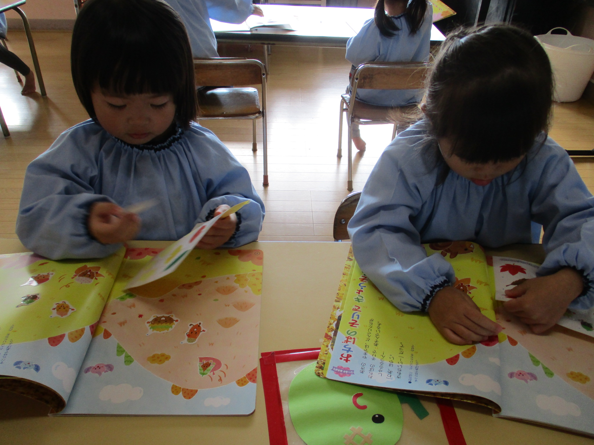 シール貼りは毎月楽しみにしています。絵本のお話しにも興味を持ち、聞いています。