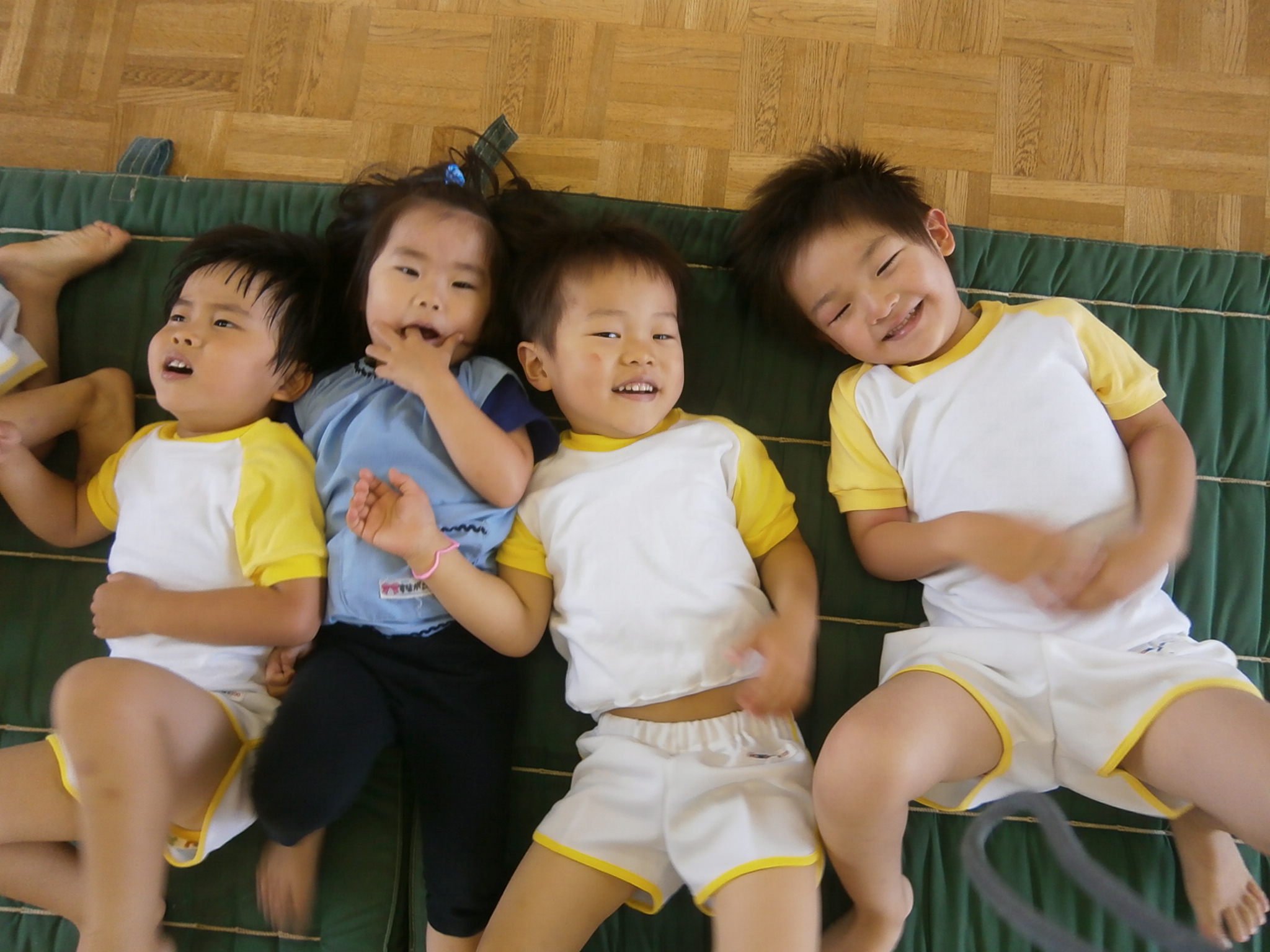 体育マットの上で、ニコニコ笑顔で「鉛筆ゴロゴロ~♪」