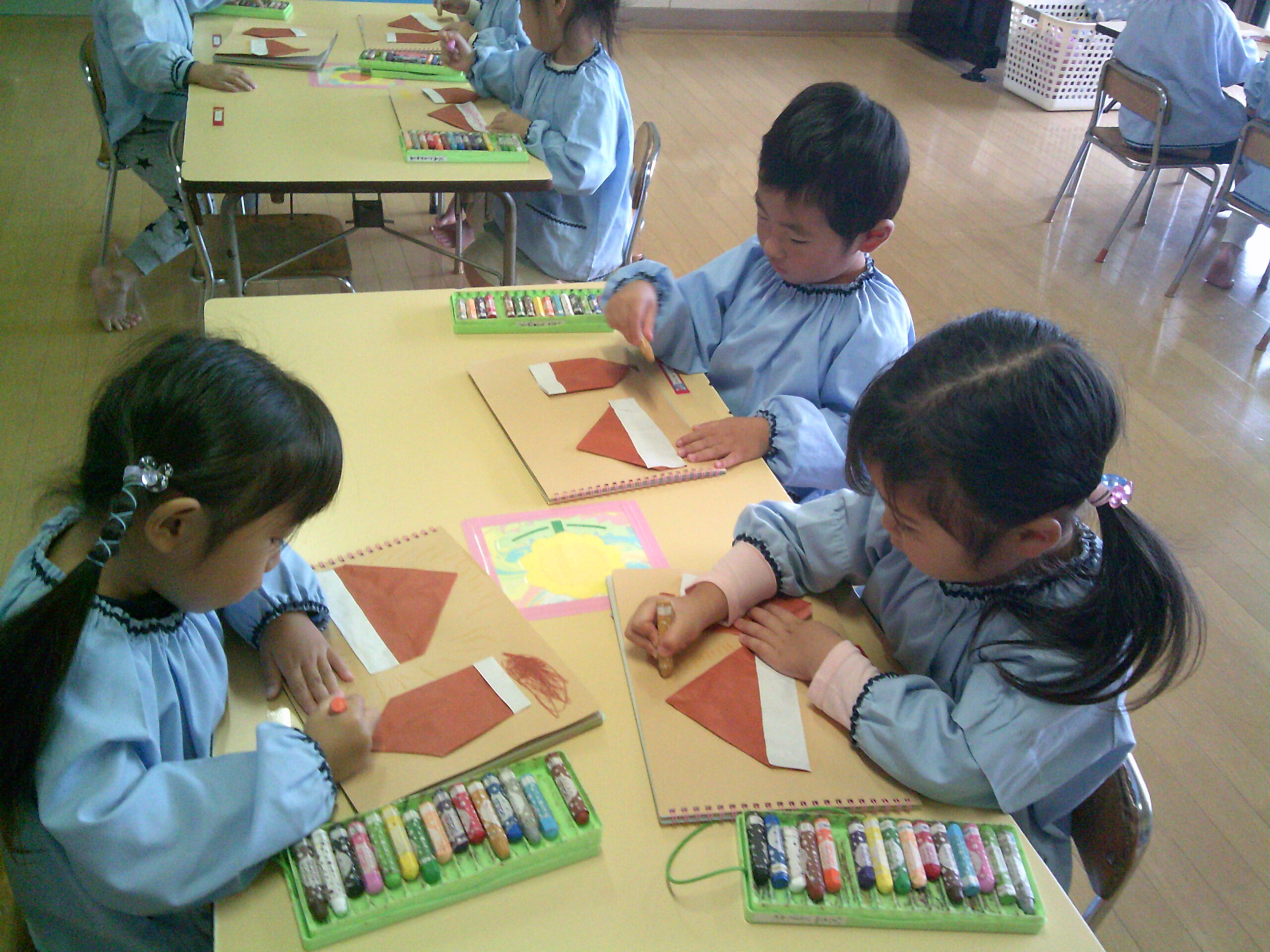 折り紙の角と角を合わせて「くり」「どんぐり」を折りました。上手になったお友達!!
