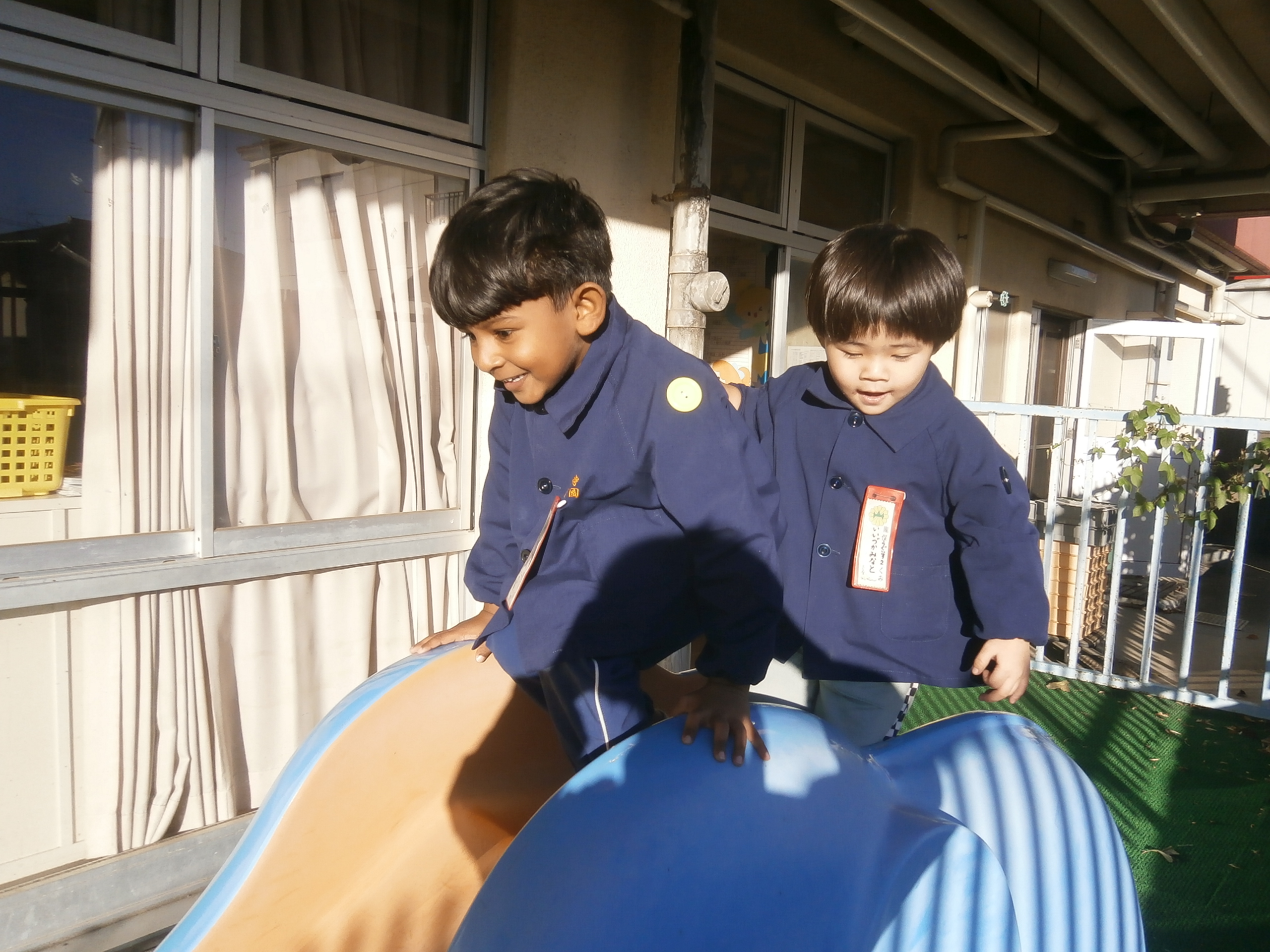 暖かい午後、お昼寝から起きておやつを食べた後。エネルギーチャージして元気いっぱい!ベランダで遊びました。滑り台を滑ったり、お友達とお家に入ったり園庭とはまた違った楽しさを味わいました。