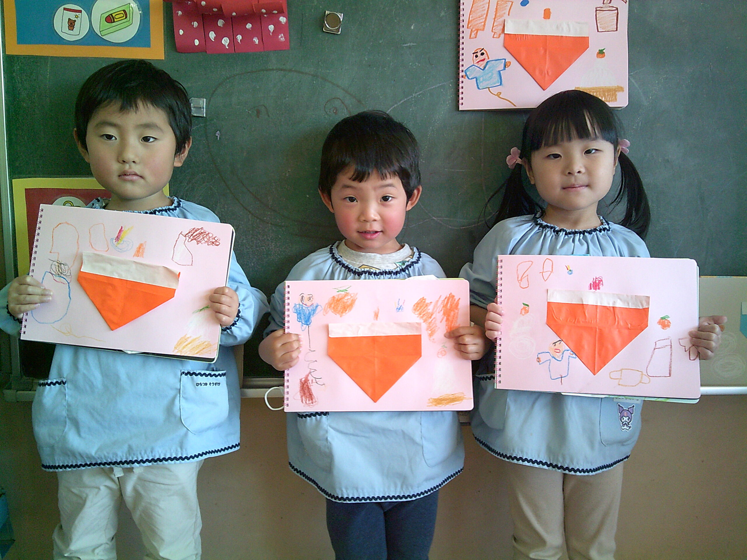 折り紙でコマを折っています。角と角を合わせたり、折り目を付けたり、みんな上手になりました。