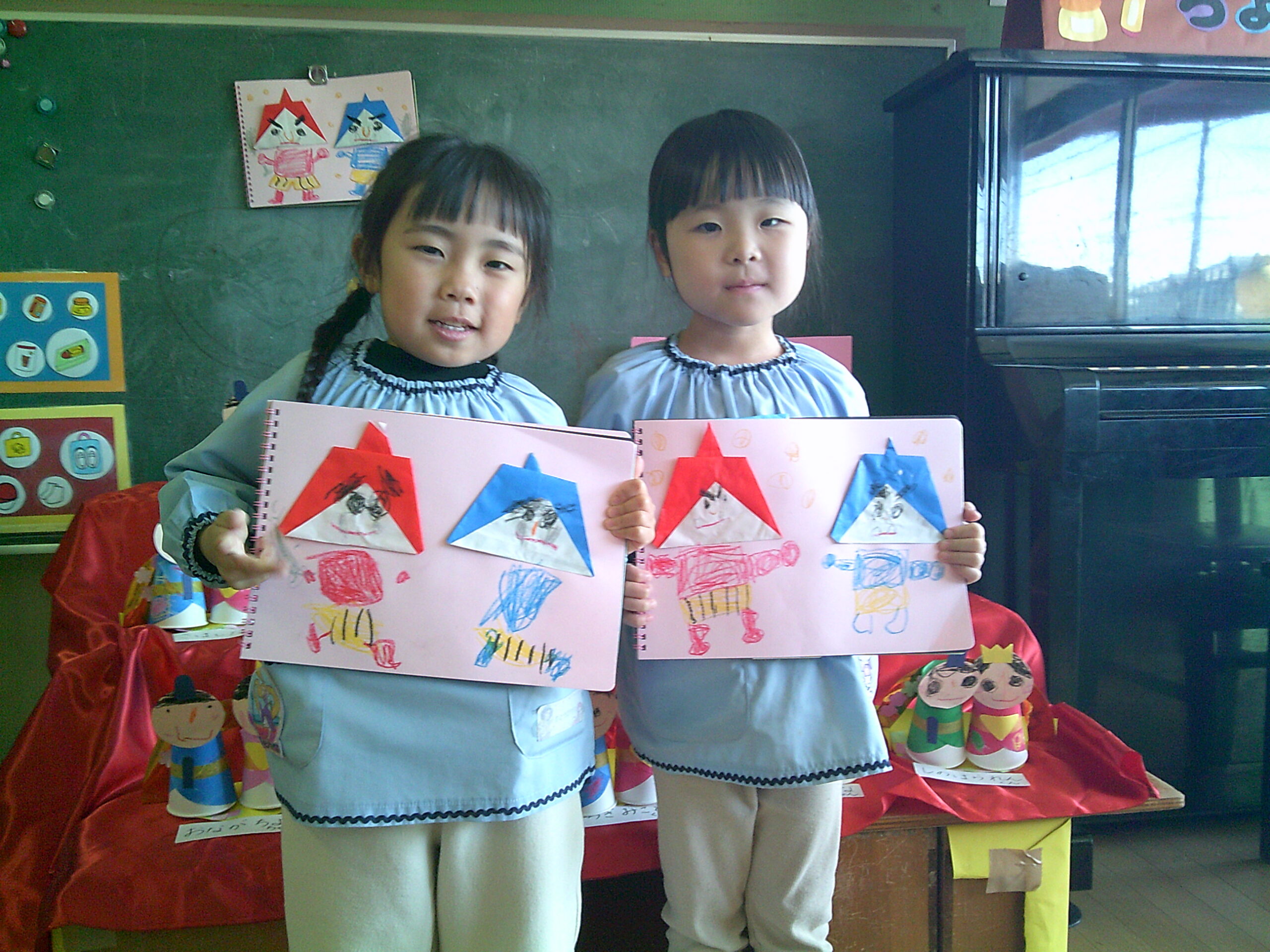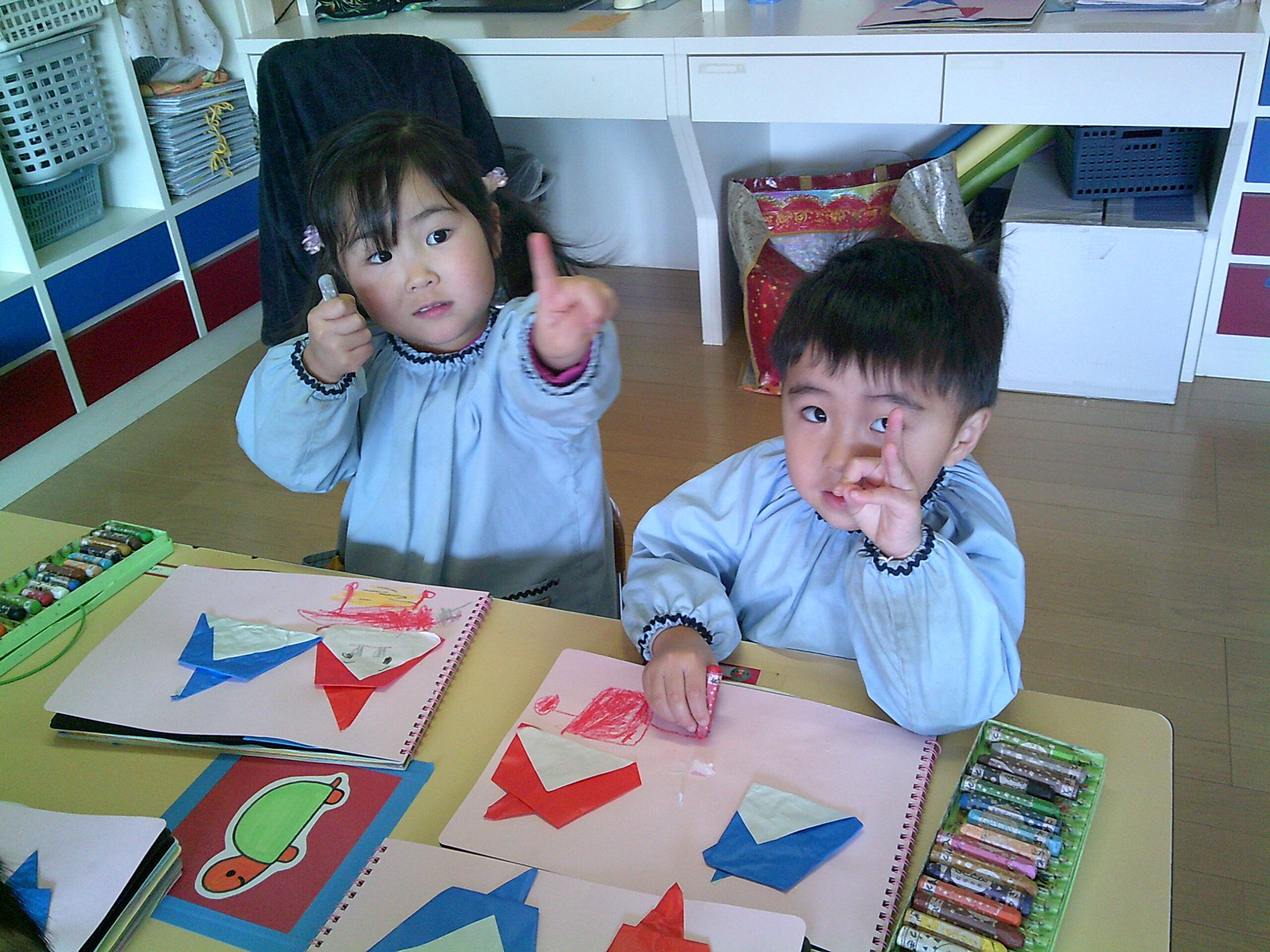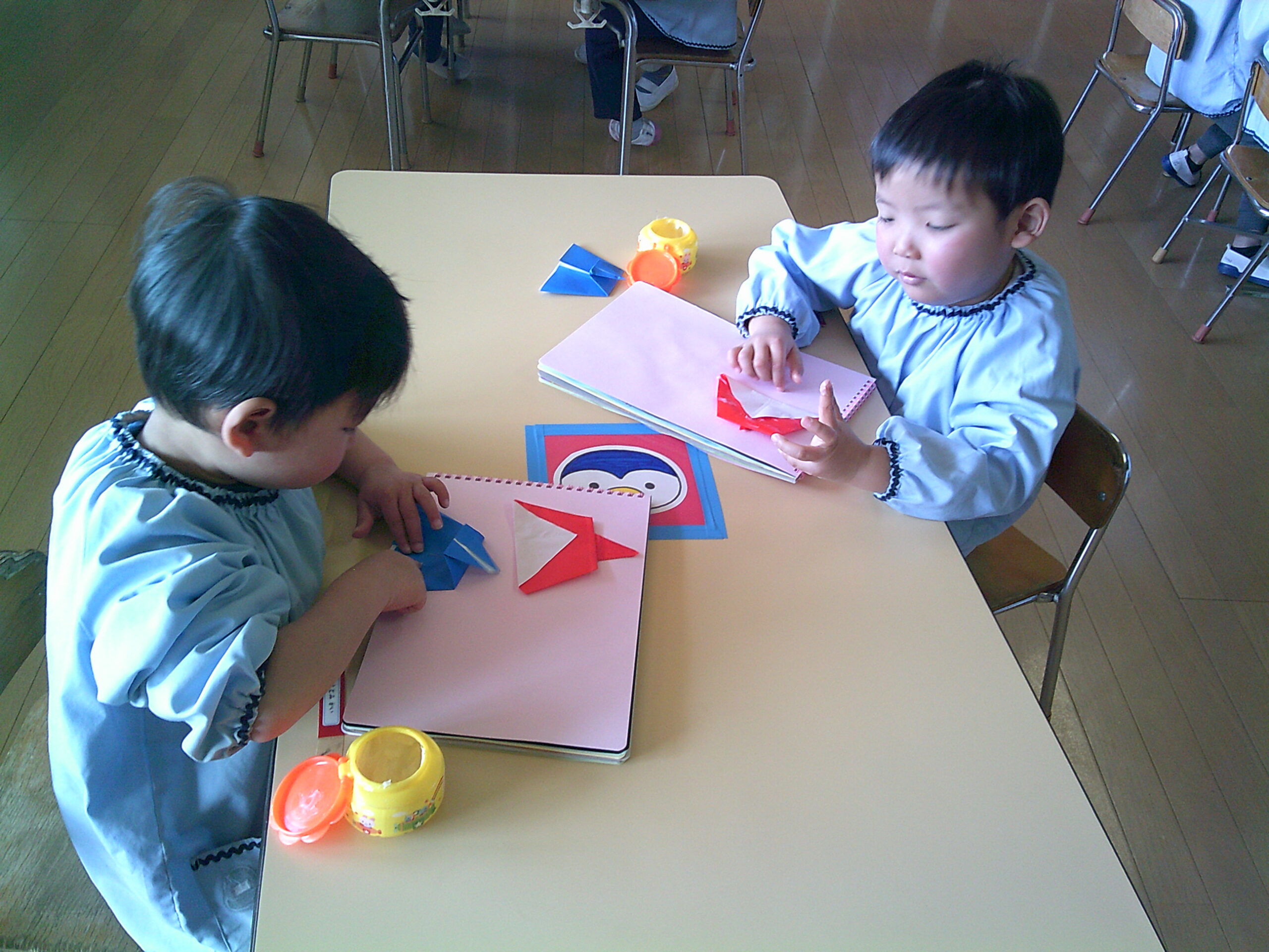 赤と青の折り紙でおにの顔をお折りました。のりを使って制作帳に貼っています。