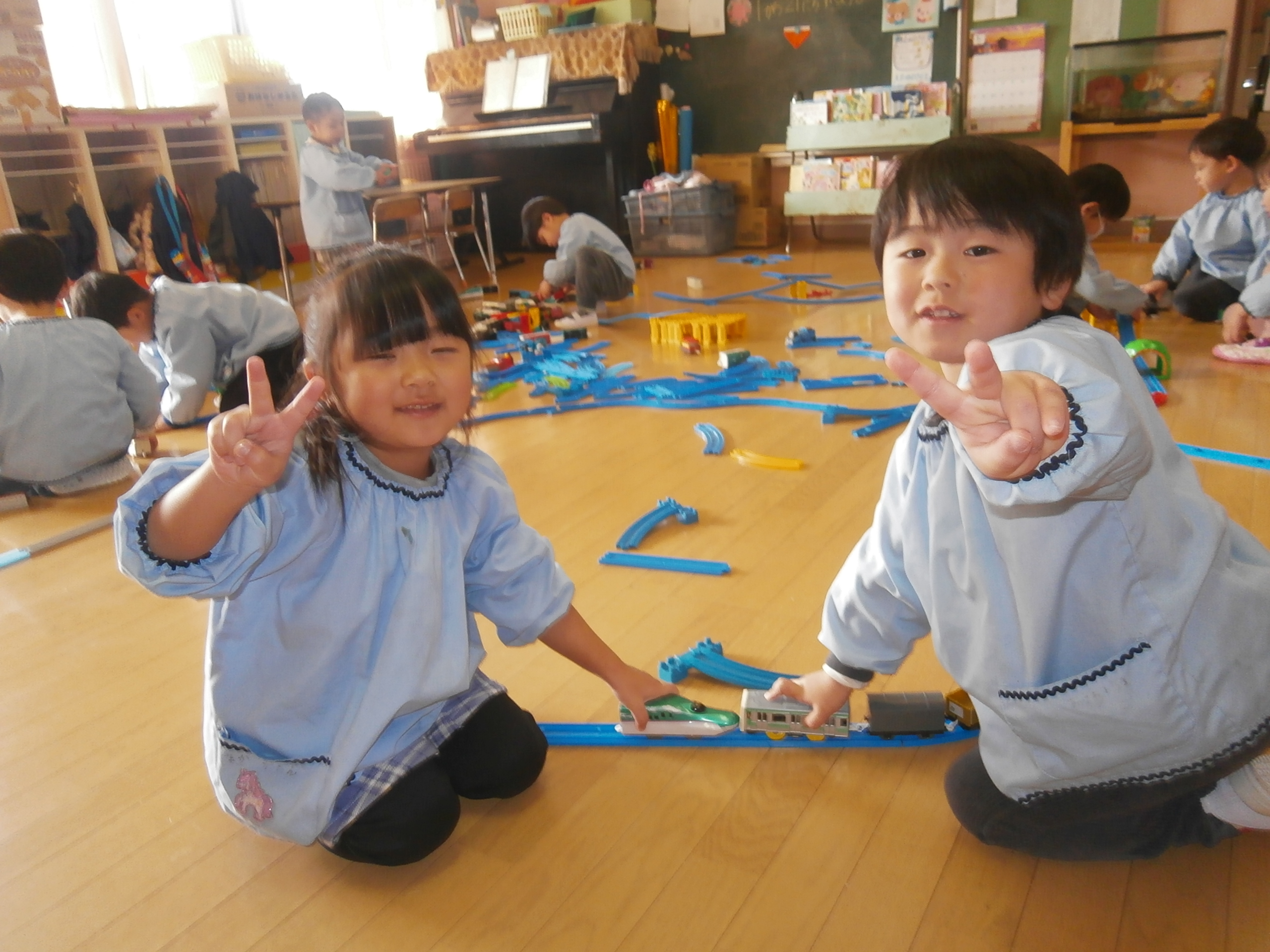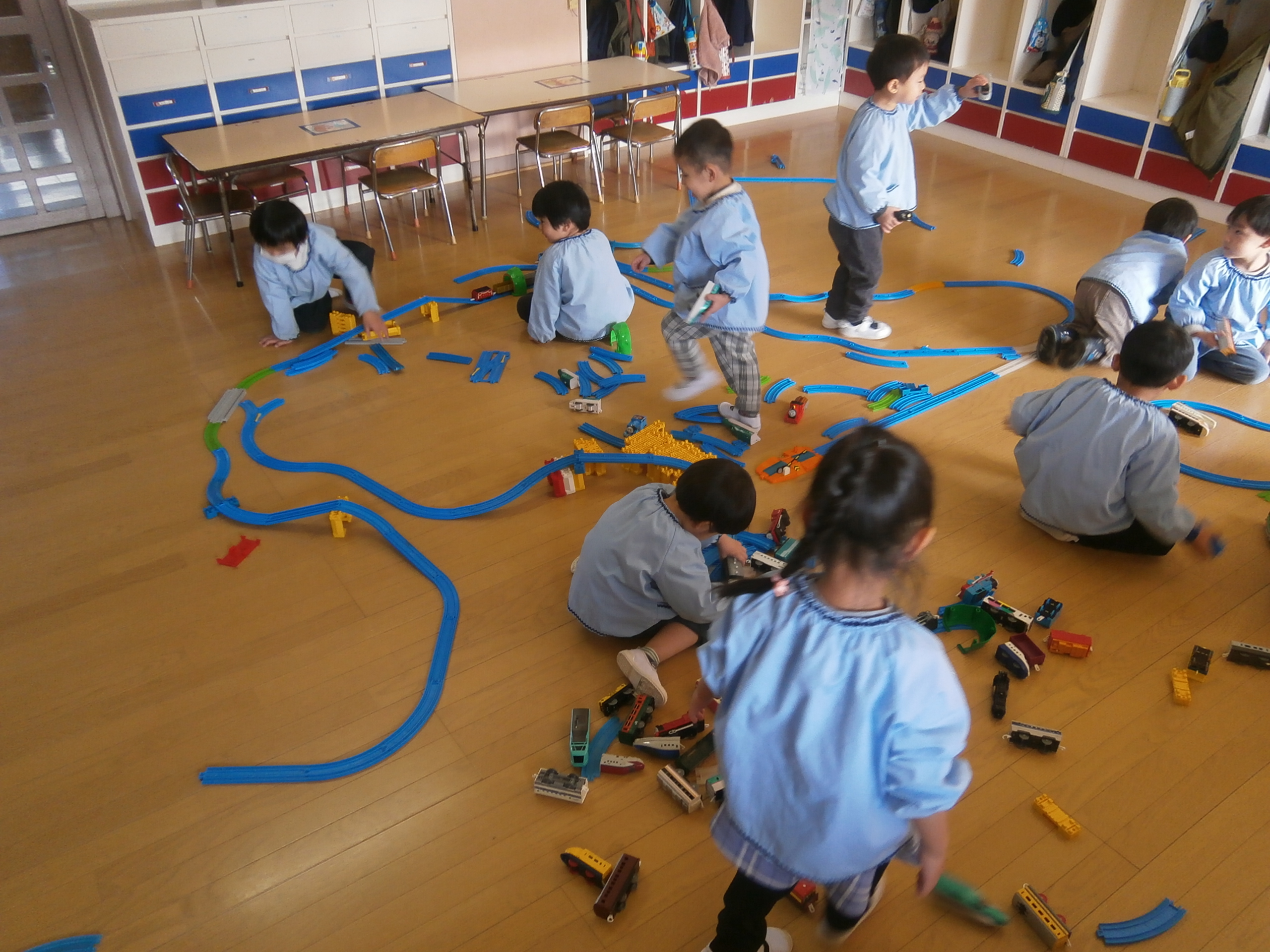 みんなの大好きなプラレールで遊びました。レールを繋いでコースを工夫して作っていました。電車を走らせるだけでなく、家族になったり、先生と子供たちになったり、お店が開店したり、あちこちでストーリーが展開していました。社会にも目が向き始めているんですね。お部屋いっぱいに広げて楽しみました。