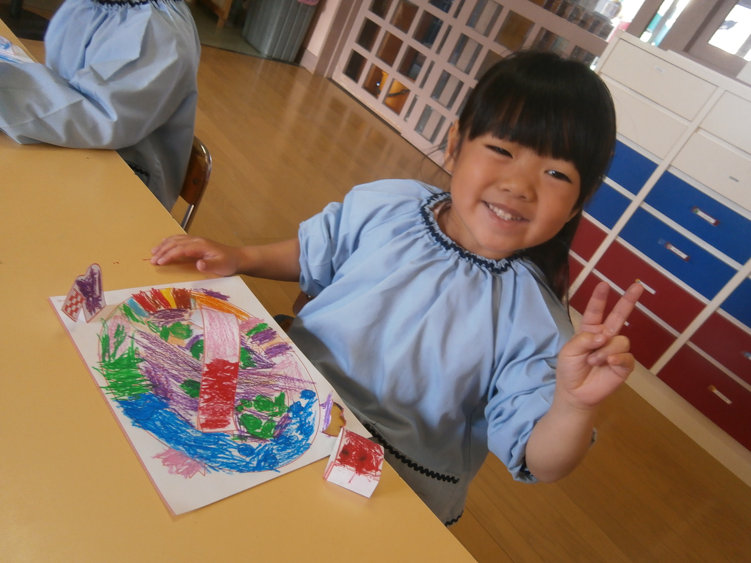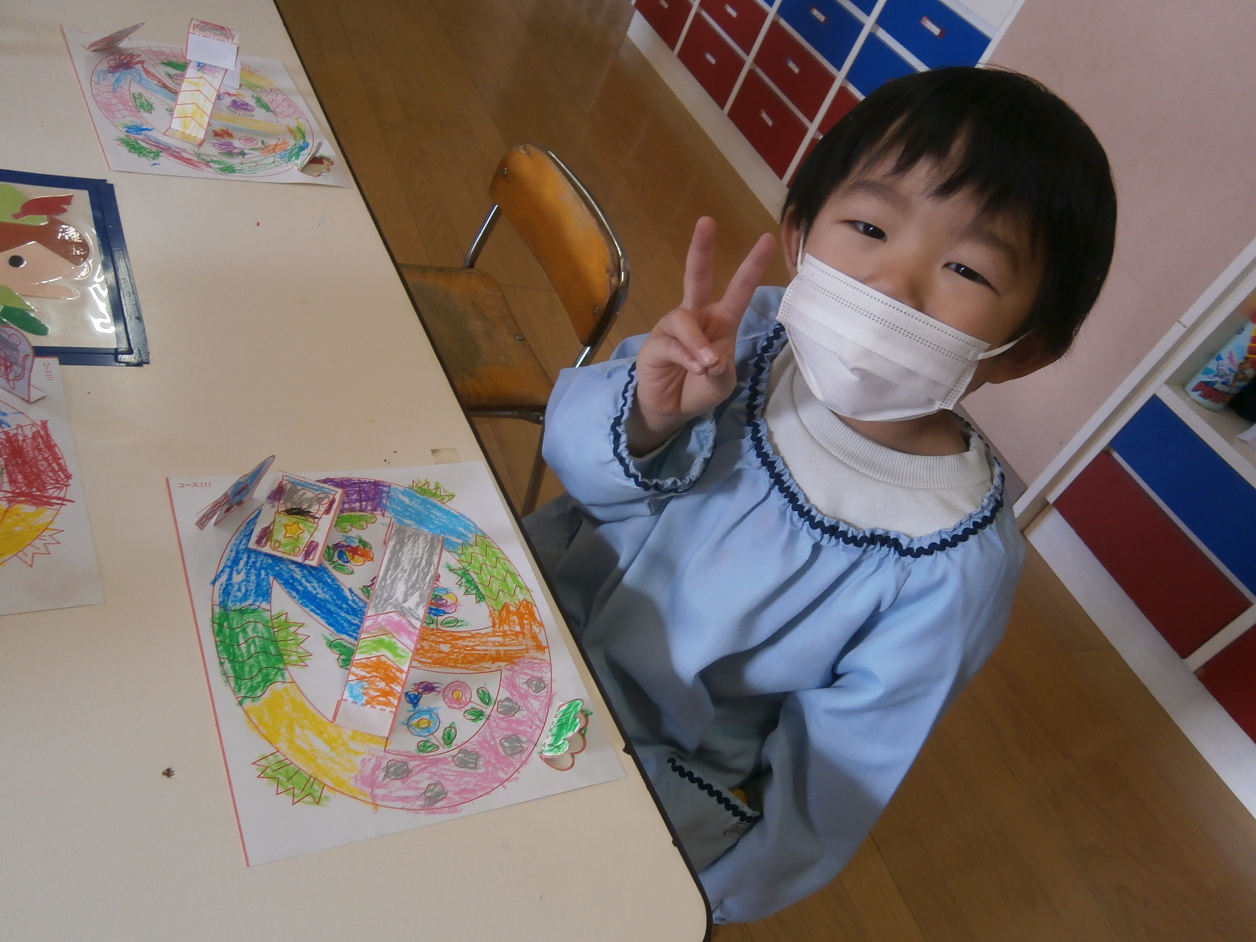 細かいパーツも丁寧にクレヨンで塗ってゴーカートのコースと車を作りました。カラフルで楽しそうなコースが完成しました。お友達と楽しく遊びました。